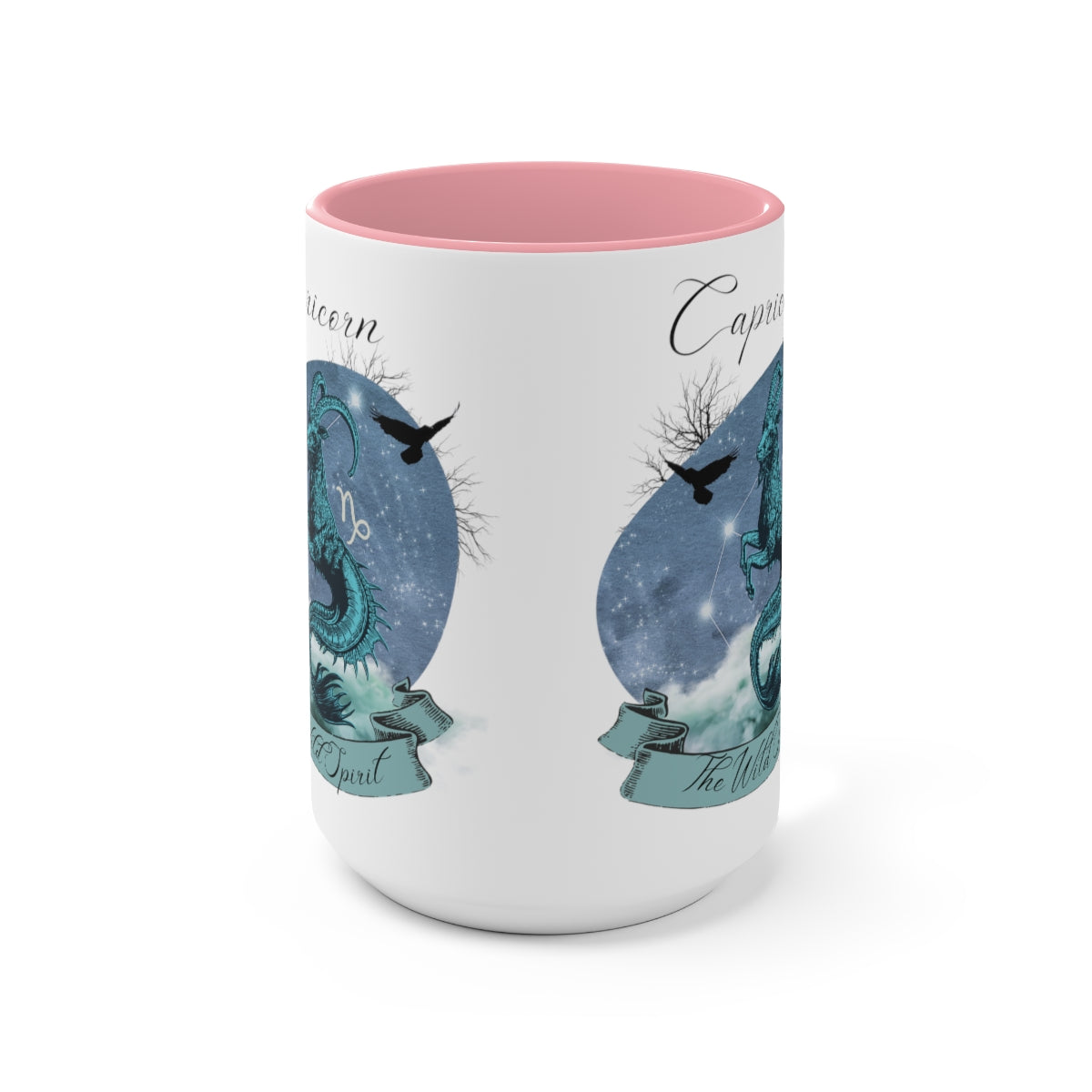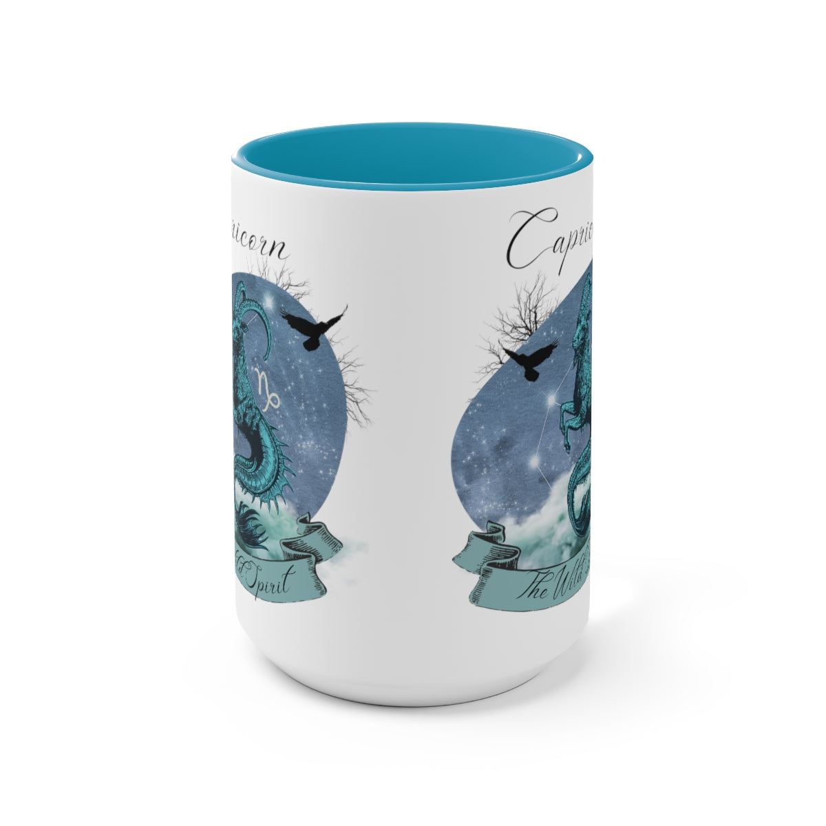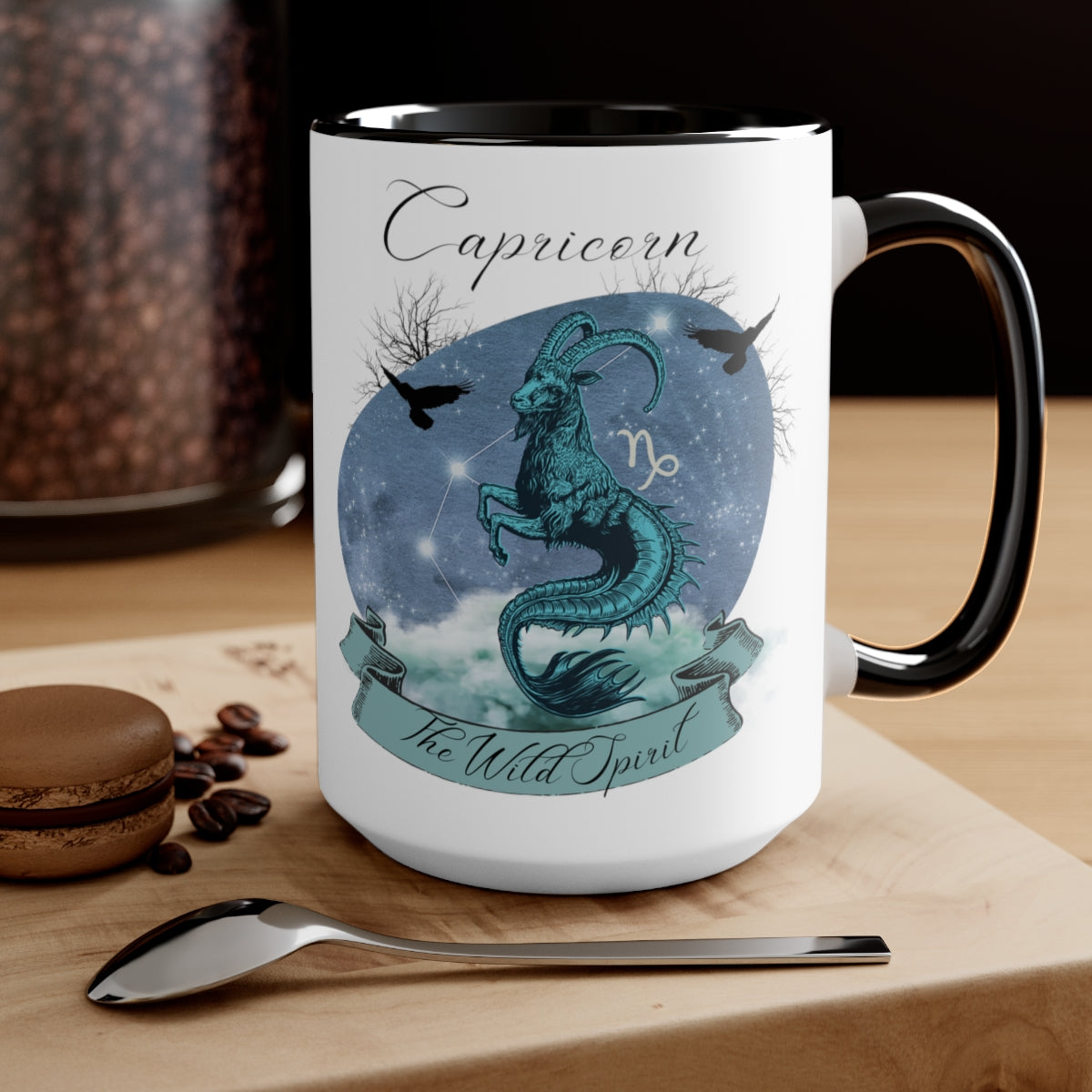 This Capricorn Zodiac The Wild Spirit Two-Tone Coffee Mugs, 15oz is here to bring big gulps of coffee and style, these two-tone coffee mugs help people around the world start the day just right. Choose between 5 different color options to best complement your designs. Each mug comes with a colored handle, a colored interior, and a classy, glossy finish so that your mugs become an instant favorite. .: Material: 100% ceramic .: One size: 15oz (0.44 l) .: Glossy finish .: Interior and handle available in 5 colors .: Easy-grip C-shaped handle