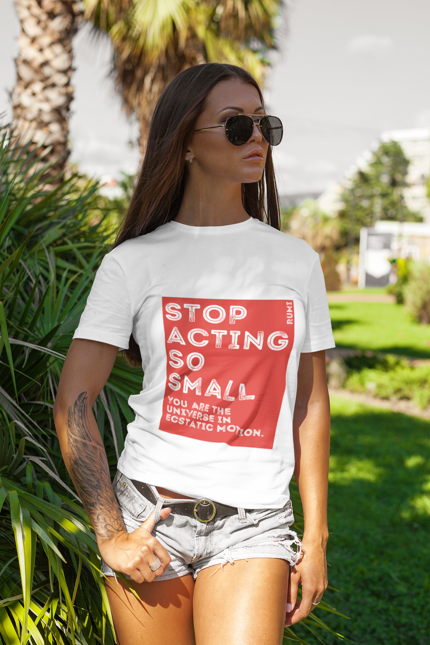 This Rumi Quote, Stop Acting So Small You Are The Universe in Ecstatic Motion designed in a Red and White Graphic | Unisex Jersey Short Sleeve Tee is a classic unisex jersey short sleeve tee and perfect if you like compliments on your t shirts. Soft cotton and quality print make users fall in love with it over and over again. These t-shirts have-ribbed knit collars to bolster shaping. The shoulders have taping for better fit over time. Dual side seams hold the garment's shape for longer.